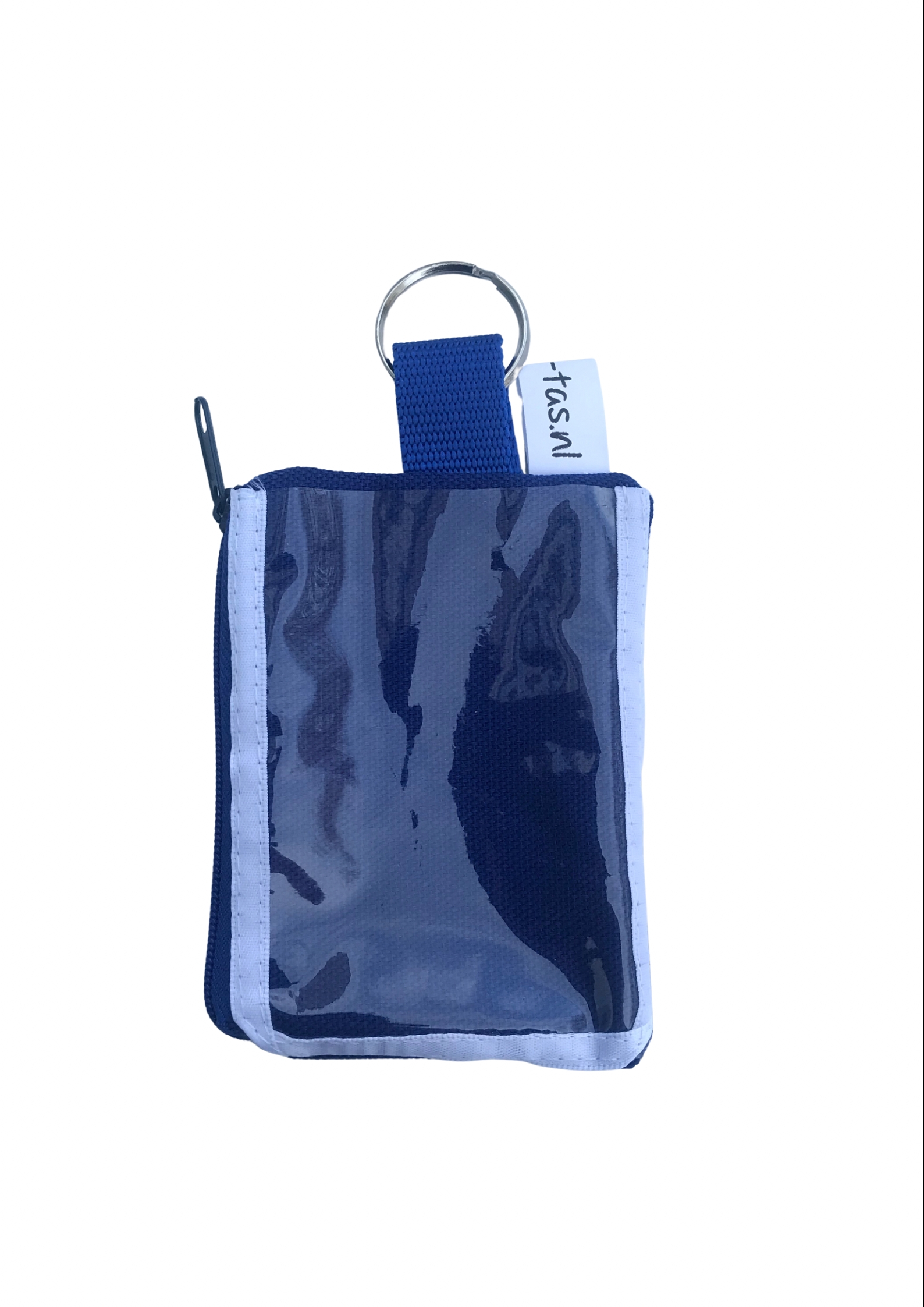 Deze sleutelhanger is gemaakt van kobalt blauwe stof . De sleutelhanger sluit met een rits en is voorzien van een doorzichtig vakje voorop voor adres en eventueel medische gegevens.